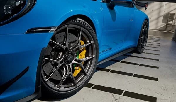 To further reduce the overall weight of the vehicle, which is already designed according to lightweight construction criteria, the 20-/21-inch 911 Manthey lightweight wheel set technologically optimizes the design of the standard wheel. The result: A reduction in springless and rotating masses of 16.1 lbs. (7.3 kg) per vehicle set, which noticeably benefits the response of the spring/damper elements and further improves vehicle controllability.