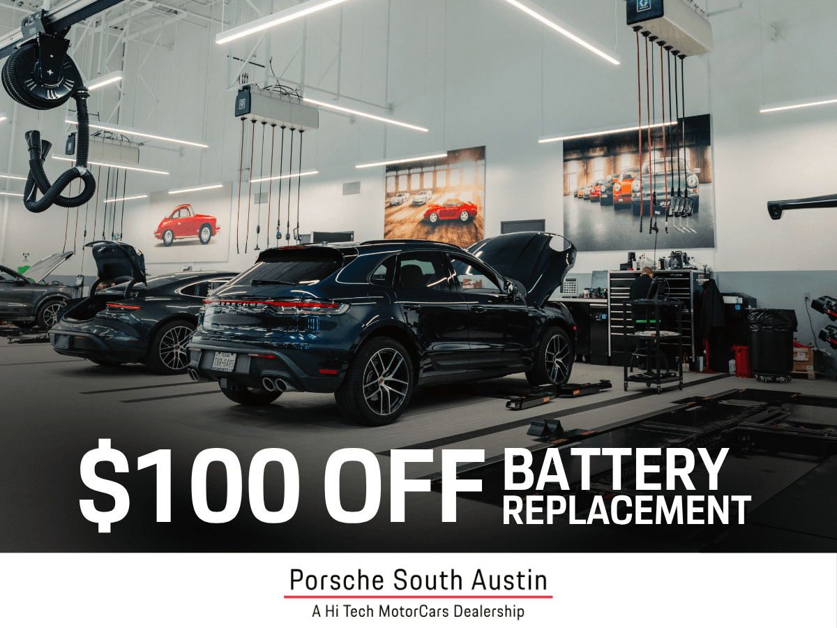 Save $100 on Porsche battery replacement at Porsche South Austin. Genuine parts, expert service.