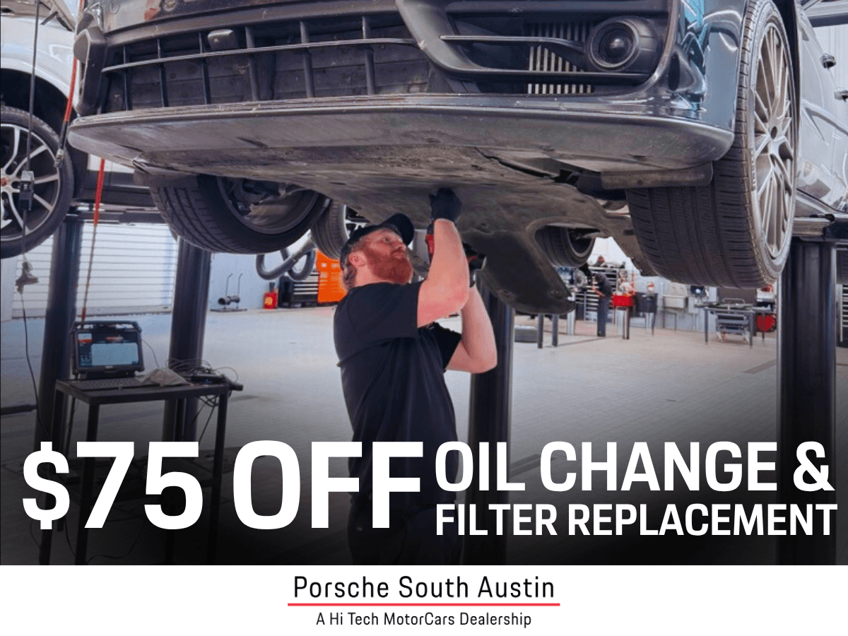 Save $75 on Porsche oil and filter change at Porsche South Austin. Genuine parts and expert care.